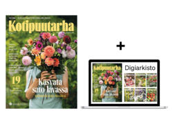 Kotipuutarha-lehti kotiin kannettuna ja digitunnukset, joilla pääset lukemaan näköislehtiä ja kirsikka-symbolilla merkittyjä artikkeleita Kotipuutarhan nettisivuilla. Vuositilaukseen sisältyy myös vapaavalintainen tilaalahja. Vuonna 2026 Kotipuutarha ilmestyy 8 kertaa. Ilmestymiskalenteri 2026 Normaalihinnat vuonna 2026: uusi kestotilaus 98 €/vuosi, määräaikainen tilaus 109 €/vuosi.